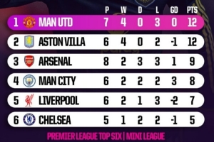 本赛季英超前六相互交锋积分榜:曼联、维拉积12分最高,枪手9分