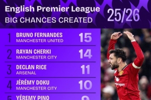 本赛季英超创造重大机会榜:B费15次居首,谢尔基、赖斯二三位