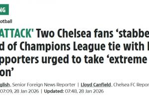 太阳报:2名切尔西球迷遇袭,遭25名那不勒斯极端球迷追赶后刺伤
