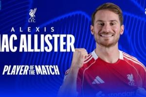 梅开二度,官方:麦卡利斯特当选利物浦6-0卡拉巴赫全场最佳
