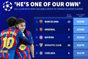 欧冠俱乐部青训球员身价榜:巴萨5.85亿欧居首,阿森纳、拜仁前三