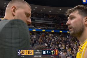 大小胖聊啥呢?赛后约基奇径直走向东契奇!两人拥抱完后攀谈几句