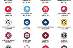 德勤足坛财富收入榜:皇马11.6亿欧第1,萨仁巴黎+BIG6霸占前10名