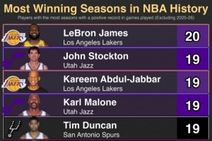 生涯胜率过半赛季排行:詹姆斯20次独霸第一 邓肯贾巴尔等人居次