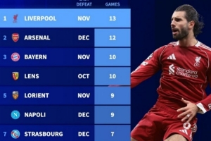 五大联赛球队目前不败场次榜:利物浦13场居首,阿森纳12场次席