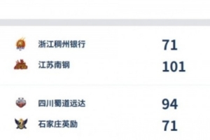 浙江稠州银行 71-101 江苏南钢。由于双方实力存在明显差距,江苏女篮并未遇到实质性的威胁,全队5人得分上双,许晨妍24分15篮板大号两双,阿利恩21分14篮板,琼斯22分,黄琨15分。浙江女篮发挥最出色的是董可尔,她得到23分。