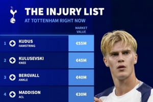 德转盘点热刺伤员身价:总价2.55亿欧,库杜斯5500万欧最高