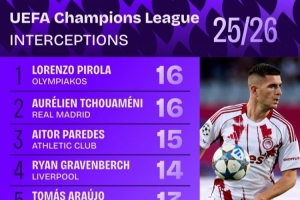 本赛季欧冠拦截次数排名:琼阿梅尼、皮罗拉16次居首