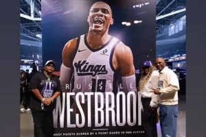 国王官方为威少制作历史控卫得分王海报 威少父母&弟弟共同合影