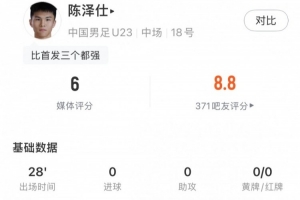 陈泽仕全场数据:传球成功率83.3%+长传准确率100%,评分6分